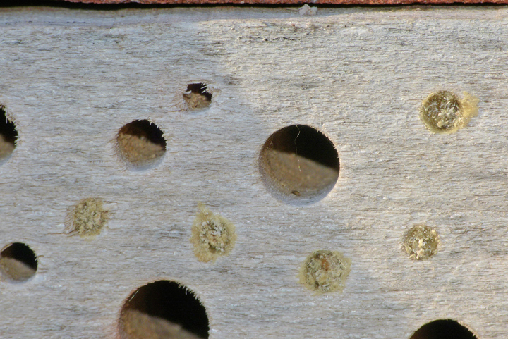 Die Löcher in den Mauersteinen und im Lehm waren unberührt. Wurden diese nicht angenommen? Ich erkläre mir das so: unterschiedliche Bienenarten bevorzugen ebenso unterschiedliche Materialien ihrer Bruthöhlen, das kann mal Lehm oder Mauerstein sein oder Holz, oder die Brut wird in Halmen hineingelegt. Nun sind nicht überall alle Bienenarten vertreten, deshalb kann man an der Belegung eines Multi-Material-Bienenhotels gut erkennen, welche Arten überhaupt präsent sind.