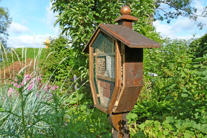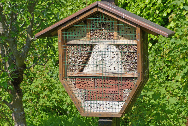 - Blütenvielfalt heißt auch Bienenvielfalt – und verschieden große Loch- und Röhrchengrößen gewährleisten viele Gäste im Hotel.