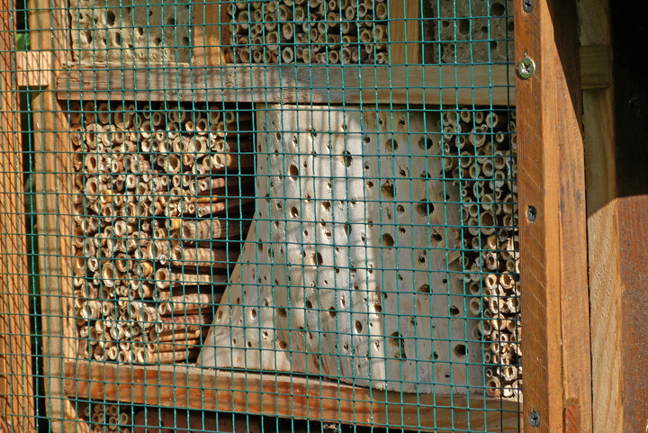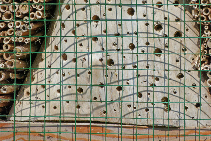 Zur Erinnerung: Ein Schutzgitter, den Winter über, vor die Front des Bienenhotels geschraubt, hält Vögel wie Meisen, Kleiber und Spechte davon ab, die Bienenunterkünfte genauer zu untersuchen – und als Futterquelle zu entdecken.