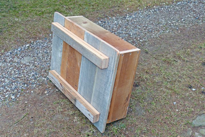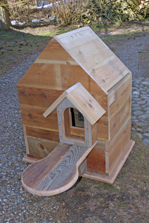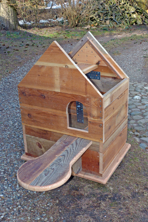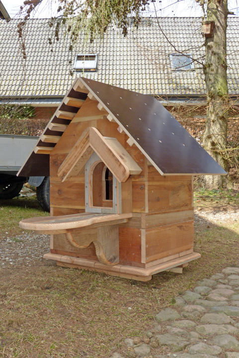 Als Material für die Wandungen dienen Bretter aus Lärchenholz, 150 mm breit und 23 mm stark, während die oberen Dachplatten und die Aufnahme des Pfahles auf der Unterseite des Bruthauses aus wasserfest-verleimten Multiplex-Platten bestehen. Nichtrostende Schrauben, Lochbleche und Schwerlastwinkel halten das Haus zusammen und als Bedachung habe ich Schindeln aus faserverstärkter und grob-besandeter Dachpappe gewählt. Ein Anstrich mit Leinölfirnis schützt das Holz von außen. Leinölfirnis härtet zwar sehr lange aus, ist dafür aber ökologisch und gesundheitlich unbedenklich und lässt das Holz „atmen“.