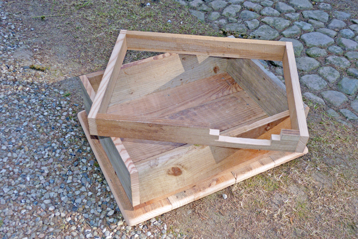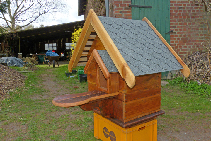 Die Abmessungen der Grundfläche betragen ungefähr 60 x 75 cm, die gesamte Höhe liegt bei 90 cm und das Anflugbrett ragt etwa 60 cm heraus. Das Haus an sich ist aus mehreren Rahmen zusammengesetzt und verschraubt. Das zweischichtige Dach mit den Lüftungskanälen und den Schindeln wird als ein Element zusammengesetzt und einfach zwischen die Giebel eingefügt.