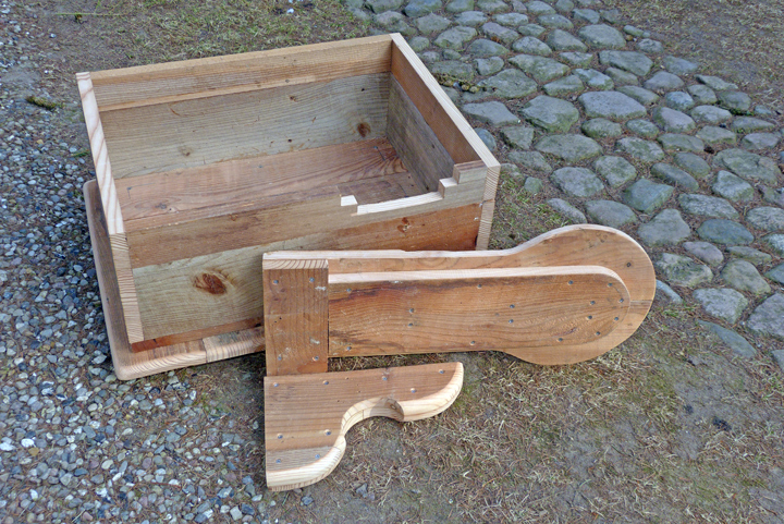 Der montierte Kasten hat, bedingt durch das massive Lärchenholz und die Bedachung, schon ein nicht unerhebliches Gewicht. Daher habe ich das Entenbruthaus so konzipiert, dass es in einzelnen Elementen vor Ort zusammengeschraubt und aufgestellt werden kann – einer mittelkräftigen Person sollte das problemlos gelingen. Bei der Auswahl des Pfahles (Länge und Durchmesser) sollte man die Belastung durch Gewicht, Wellengang und Untergrund genauestens prüfen und berücksichtigen.
