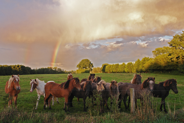 Die Islandpferde hatten scheinbar mehr Interesse an mir, warum ich ausgerechnet dort hektisch mit dem Fotoapparat hantiere anstatt ihnen Futter zu geben oder sie zu streicheln. Der Regenbogen lässt sie genauso kalt wie der Regenschauer wenige Minuten zuvor. Sie können bei Wind und Wetter draußen bleiben und brauchen noch nicht einmal einen Stall.