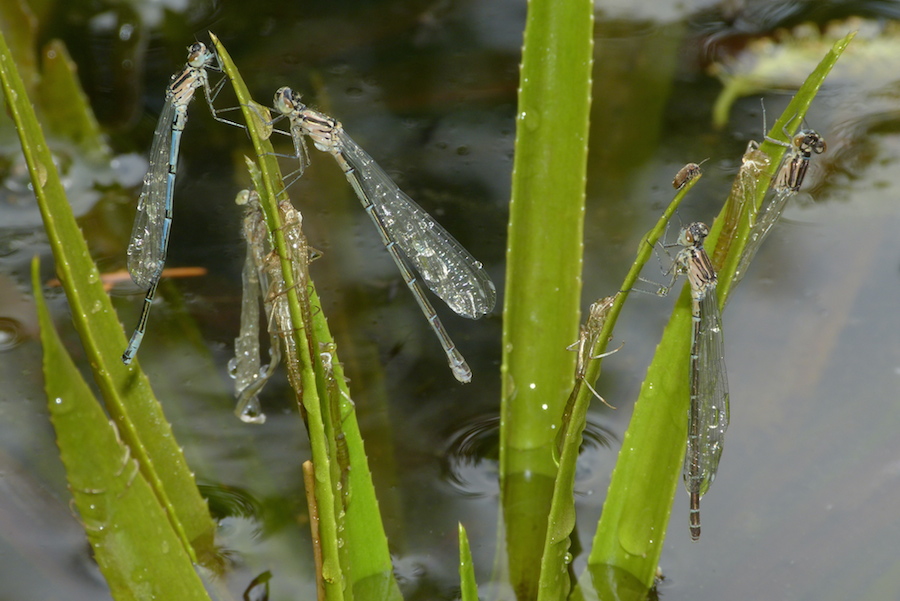 Diese kleinen Libellen sind frisch geschlüpft und warten auf die Sonne. In vielen kleinen Gewässern kann man ab Mai die ersten Libellenlarven beobachten, die sich an Wasserpflanzen emporhangeln und einen sonnigen Platz suchen. Damit beenden sie ihr zum Teil mehrjähriges Leben als räuberische Larve unter Wasser.